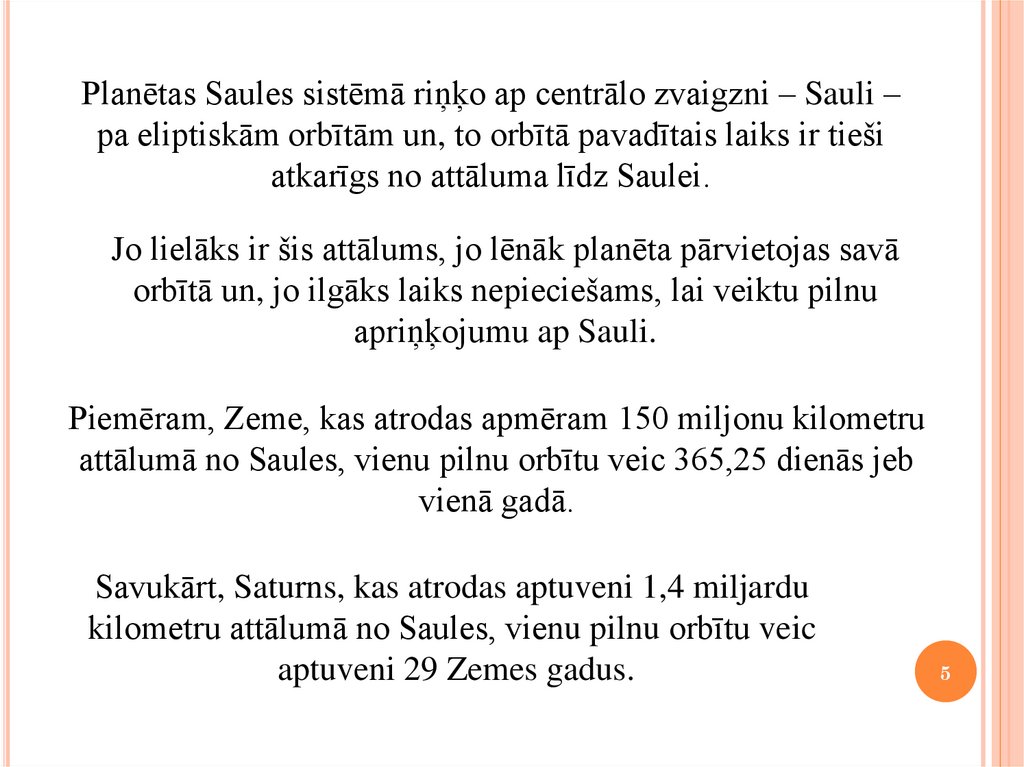 Planētas Saules sistēmā riņķo ap centrālo zvaigzni – Sauli –pa eliptiskām orbītām un, to orbītā pavadītais laiks ir tieši