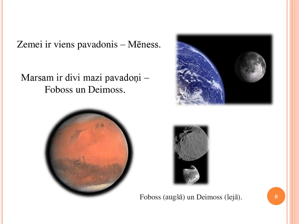 Zemei ir viens pavadonis – Mēness.Marsam ir divi mazi pavadoņi –