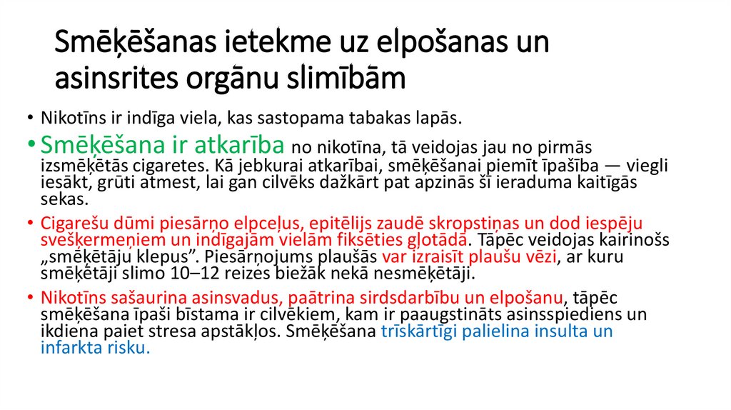 • Nikotīns sašaurina asinsvadus, paātrina sirdsdarbību un elpošanu, tāpēc