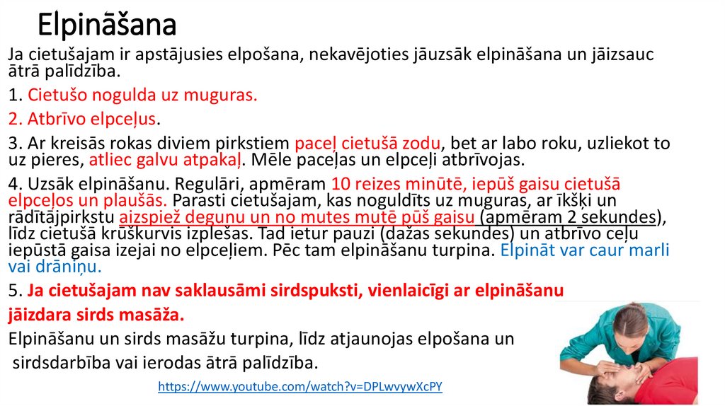 Ja cietušajam ir apstājusies elpošana, nekavējoties jāuzsāk elpināšana un jāizsaucātrā palīdzība.