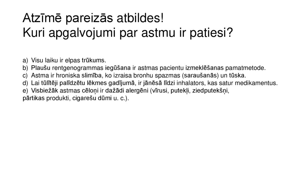 e) Visbiežāk astmas cēloņi ir dažādi alergēni (vīrusi, putekļi, ziedputekšņi,
