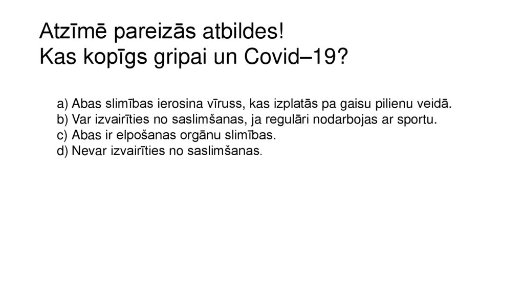 a) Abas slimības ierosina vīruss, kas izplatās pa gaisu pilienu veidā.b) Var izvairīties no saslimšanas, ja regulāri nodarbojas ar sportu.
