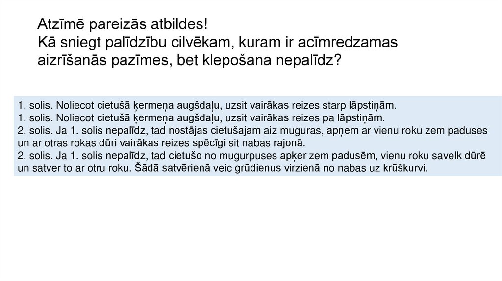 30. Atzīmē pareizās atbildes! Kā sniegt palīdzību cilvēkam, kuram ir acīmredzamas aizrīšanās pazīmes, bet klepošana nepalīdz?
