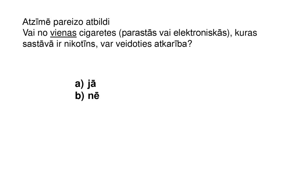 33. Atzīmē pareizo atbildi Vai no vienas cigaretes (parastās vai elektroniskās), kuras sastāvā ir nikotīns, var veidoties atkarība?