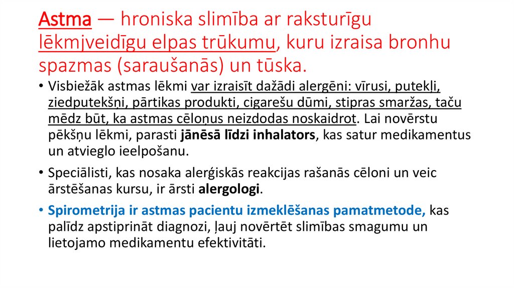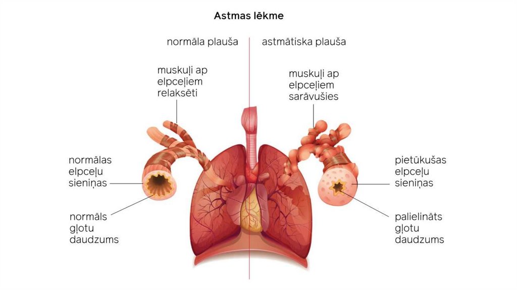 5. Astma — hroniska slimība ar raksturīgu lēkmjveidīgu elpas trūkumu, kuru izraisa bronhu spazmas (saraušanās) un tūska.