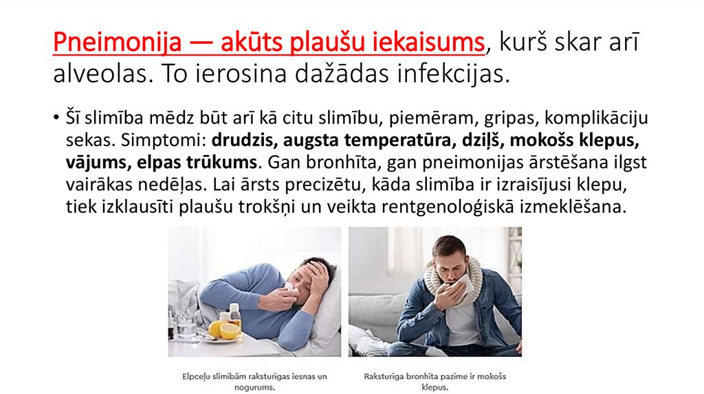 10. Pneimonija — akūts plaušu iekaisums, kurš skar arī alveolas. To ierosina dažādas infekcijas.
