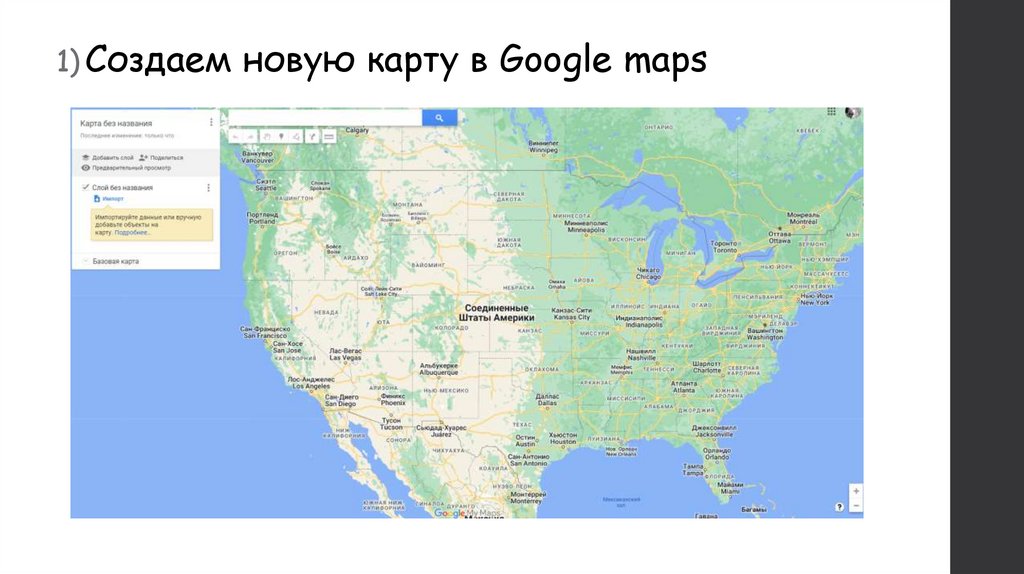 1) Создаем новую карту в Google maps13. 2) Добавление меток и линий для обозначения и рас- положения команд и их штатов