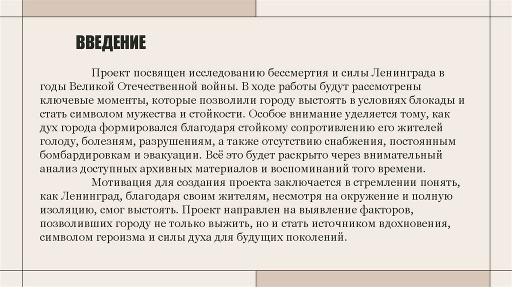 ВВЕДЕНИЕПроект посвящен исследованию бессмертия и силы Ленинграда в