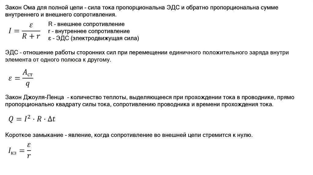 Закон Ома для полной цепи – сила тока пропорциональна ЭДС и обратно пропорциональна сумме