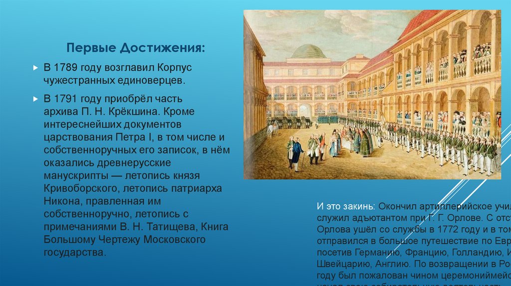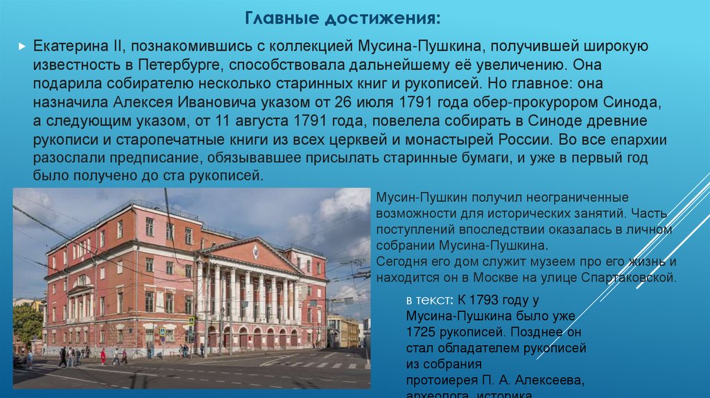 Главные достижения:Екатерина II, познакомившись с коллекцией Мусина-Пушкина, получившей широкую