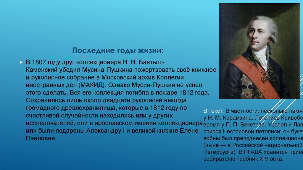 Последние годы жизни:В 1807 году друг коллекционера Н. Н. Бантыш-