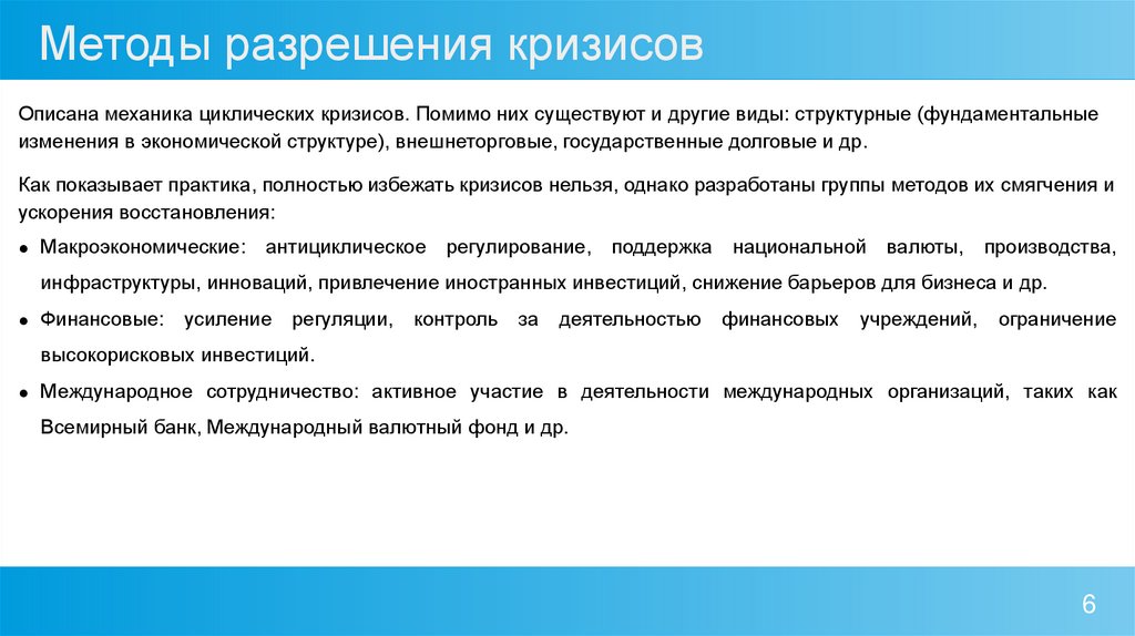 Методы разрешения кризисовОписана механика циклических кризисов. Помимо них существуют и другие виды: структурные (фундаментальные