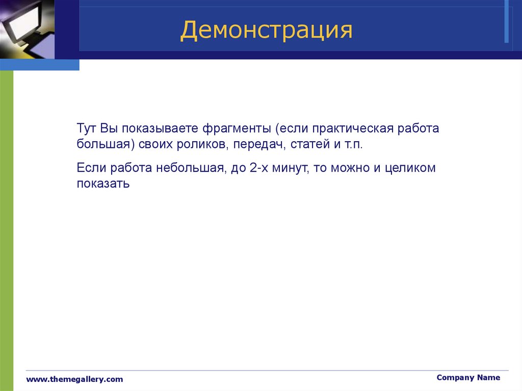 Тут Вы показываете фрагменты (если практическая работабольшая) своих роликов, передач, статей и т.п.