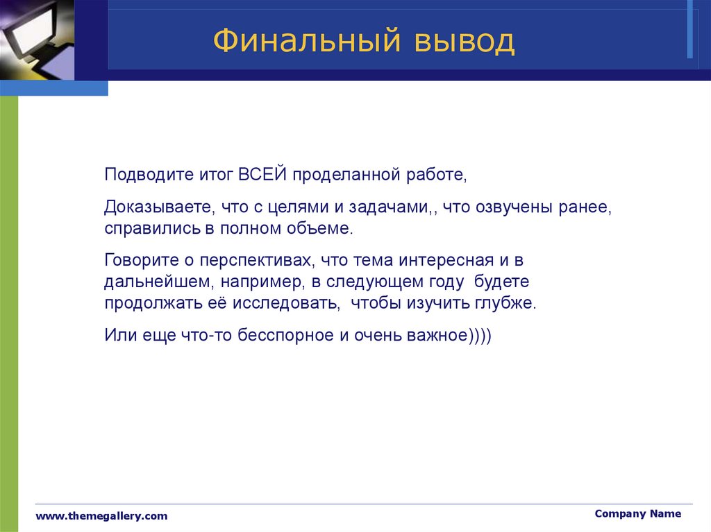 Подводите итог ВСЕЙ проделанной работе,Доказываете, что с целями и задачами,, что озвучены ранее,