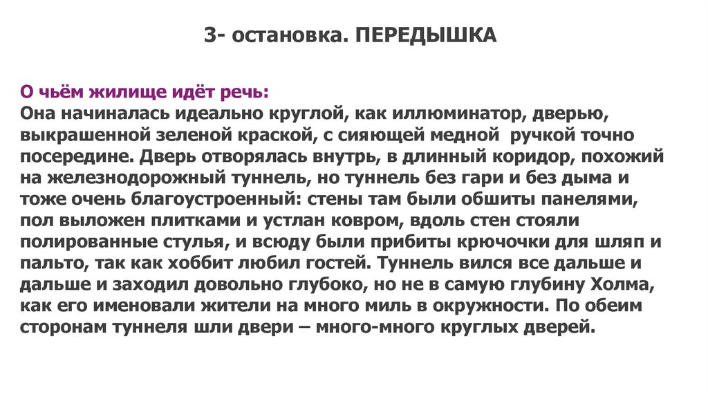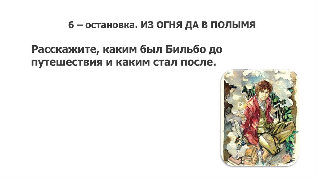 6 – остановка. ИЗ ОГНЯ ДА В ПОЛЫМЯРасскажите, каким был Бильбо до