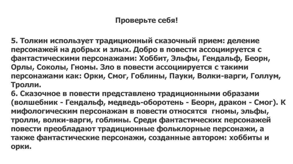 Проверьте себя!5. Толкин использует традиционный сказочный прием: деление