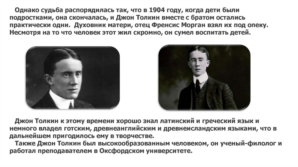 Однако судьба распорядилась так, что в 1904 году, когда дети былиподростками, она скончалась, и Джон Толкин вместе с братом остались