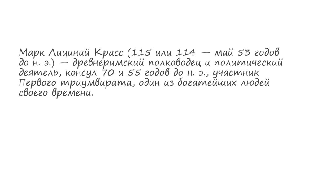 Марк Лициний Красс (115 или 114 — май 53 годовдо н. э.) — древнеримский полководец и политический