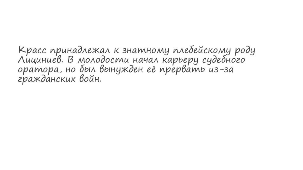 Красс принадлежал к знатному плебейскому родуЛициниев. В молодости начал карьеру судебного