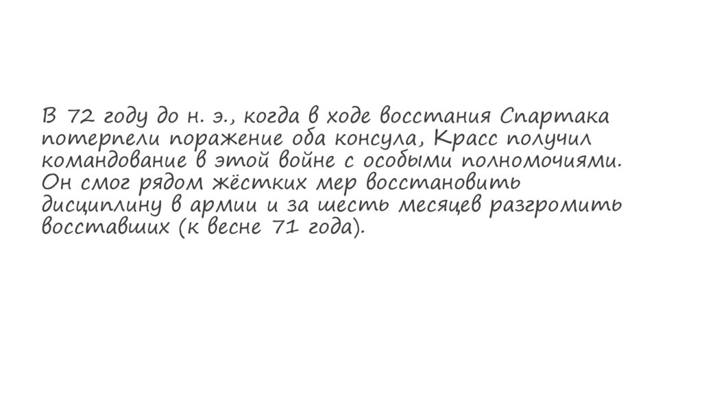 В 72 году до н. э., когда в ходе восстания Спартакапотерпели поражение оба консула, Красс получил