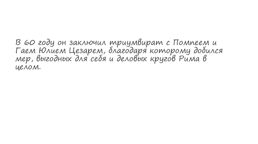 В 60 году он заключил триумвират с Помпеем иГаем Юлием Цезарем, благодаря которому добился