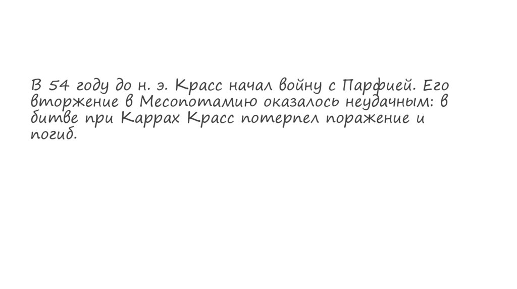 В 54 году до н. э. Красс начал войну с Парфией. Еговторжение в Месопотамию оказалось неудачным: в