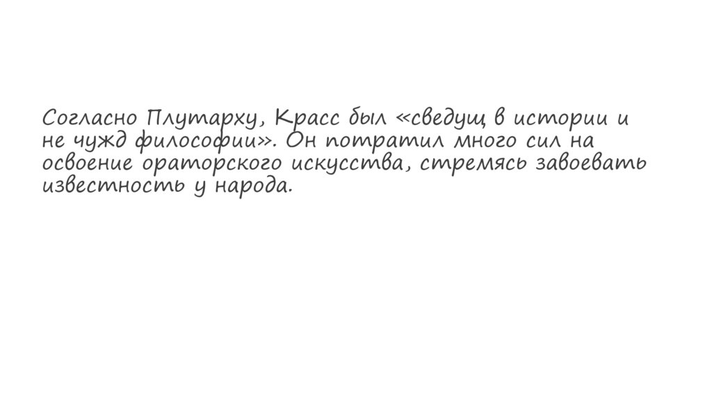 Согласно Плутарху, Красс был «сведущ в истории ине чужд философии». Он потратил много сил на