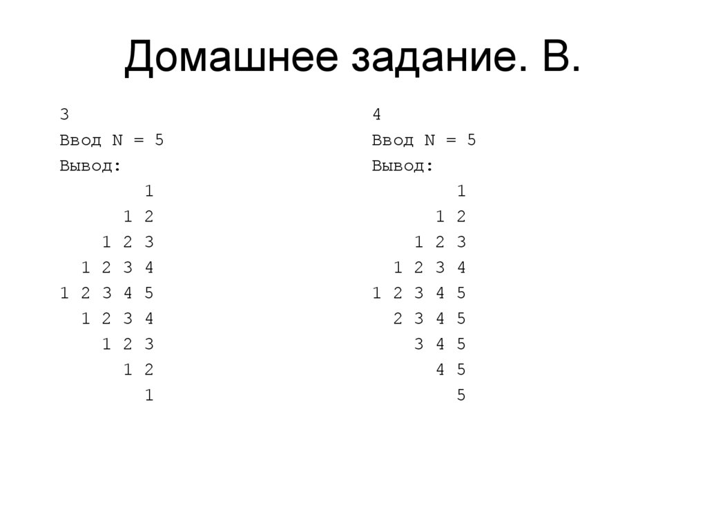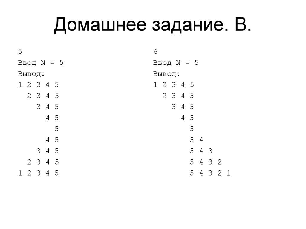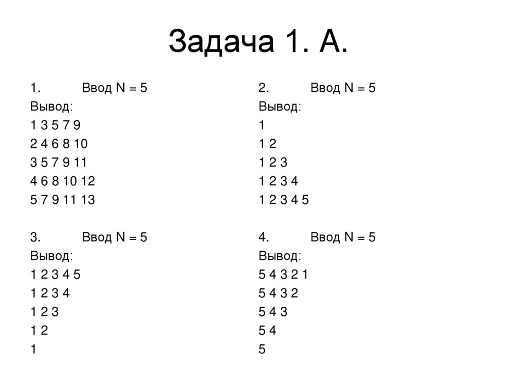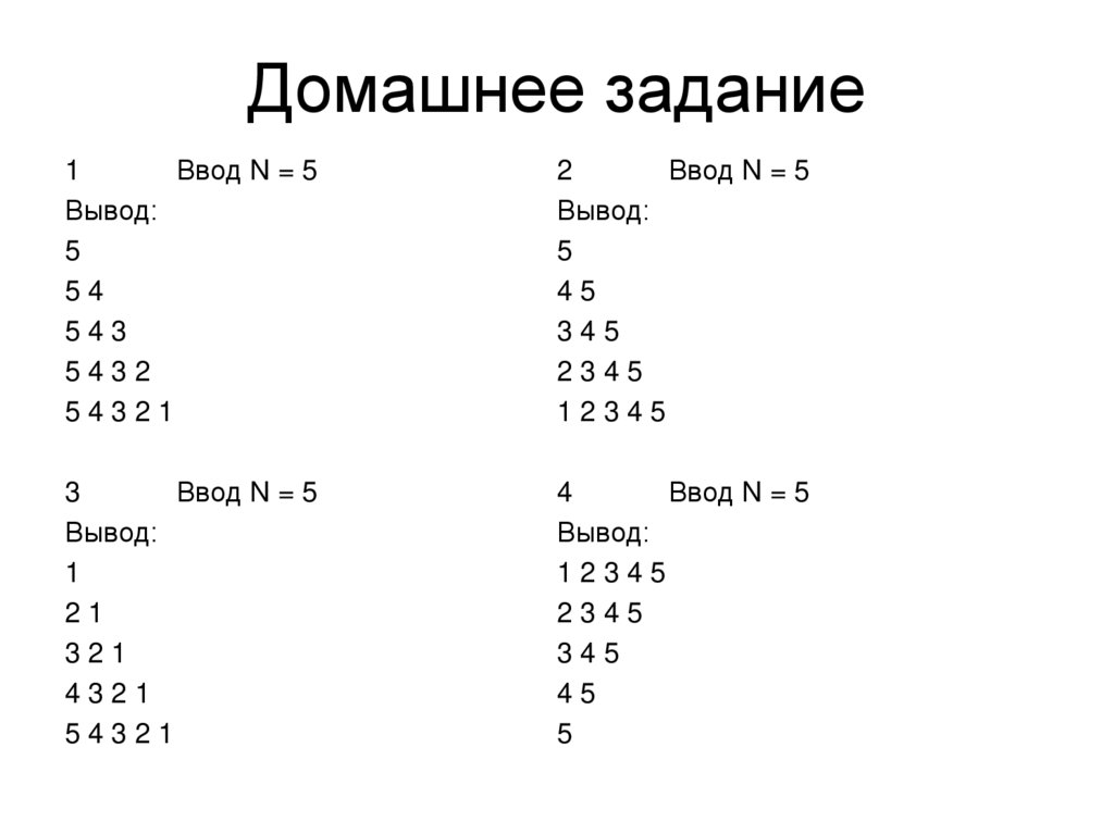 Выполнить реализацию вывода соответствующих заданиюцифровых узоров. Реализовать 1, 2 задания через циклы While, 3 и