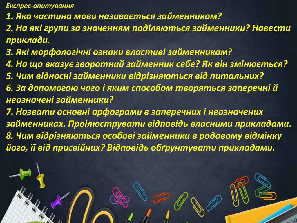займенники. З’ясувати їх групи за значенням, указати на морфологічні ознаки