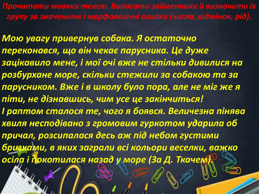 Прочитати мовчки текст. Виписати займенники й визначити їхгрупу за значенням і морфологічні ознаки (число, відмінок, рід).