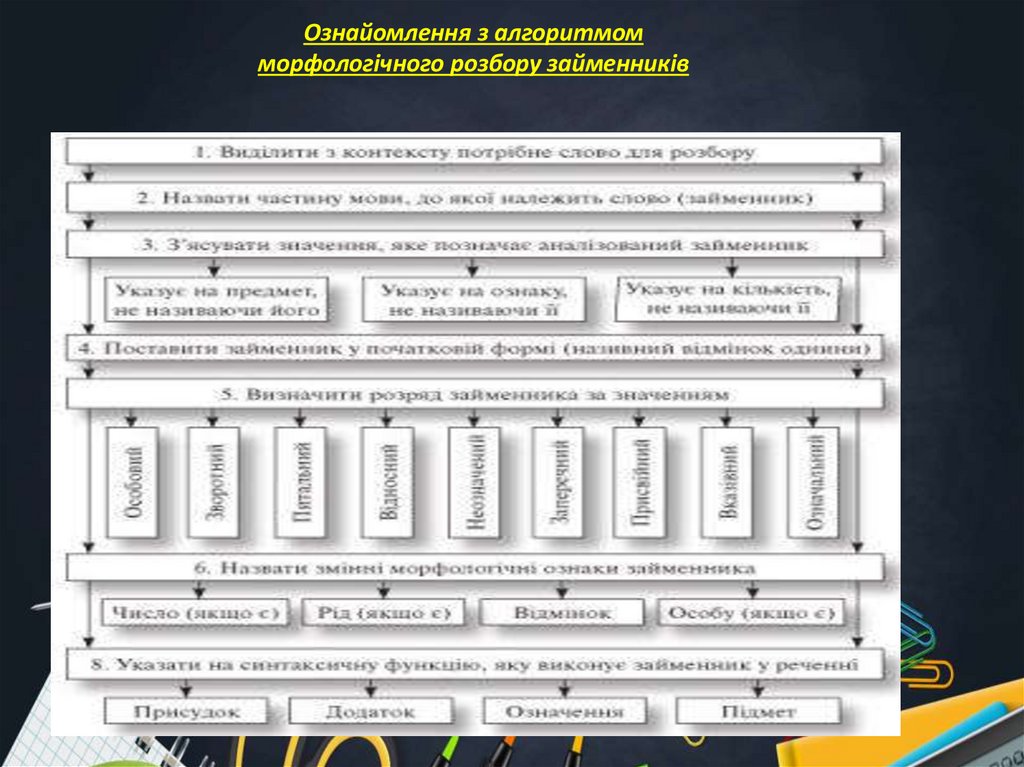 Ознайомлення з алгоритмомморфологічного розбору займенників