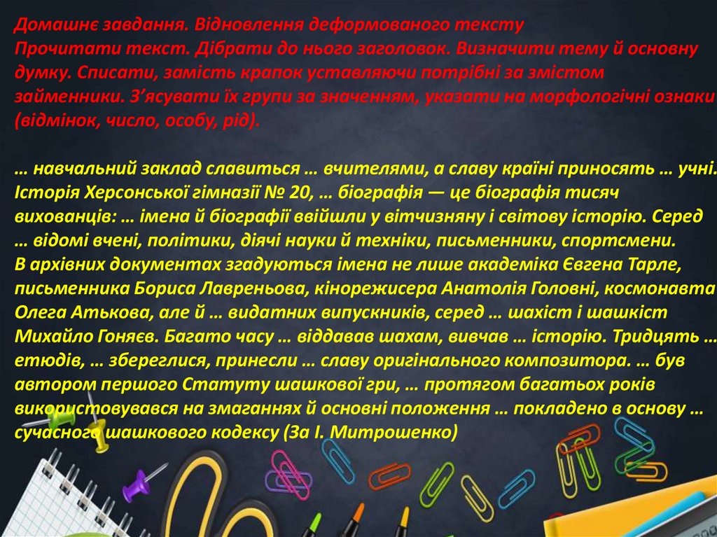 Домашнє завдання. Відновлення деформованого текстуПрочитати текст. Дібрати до нього заголовок. Визначити тему й основну