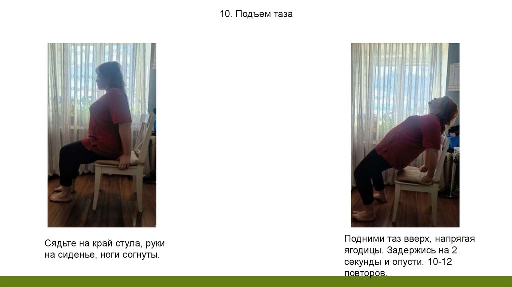 10. Подъем тазаСядьте на край стула, руки
