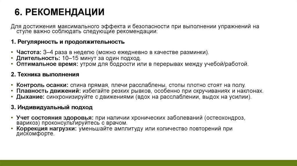 6. РЕКОМЕНДАЦИИДля достижения максимального эффекта и безопасности при выполнении упражнений на