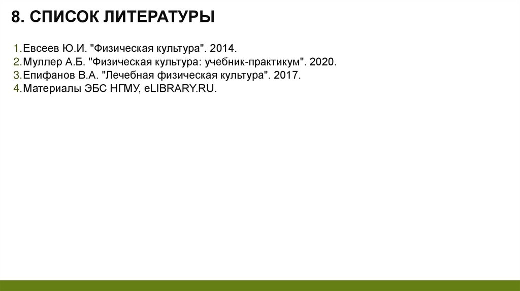 8. СПИСОК ЛИТЕРАТУРЫ1.Евсеев Ю.И. "Физическая культура". 2014.