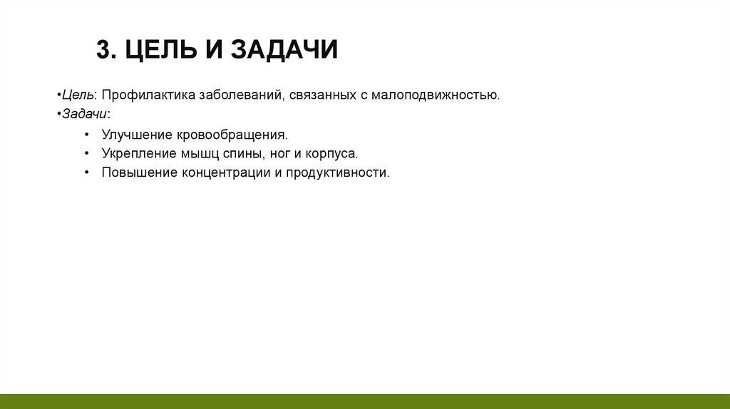 3. ЦЕЛЬ И ЗАДАЧИ•Цель: Профилактика заболеваний, связанных с малоподвижностью.