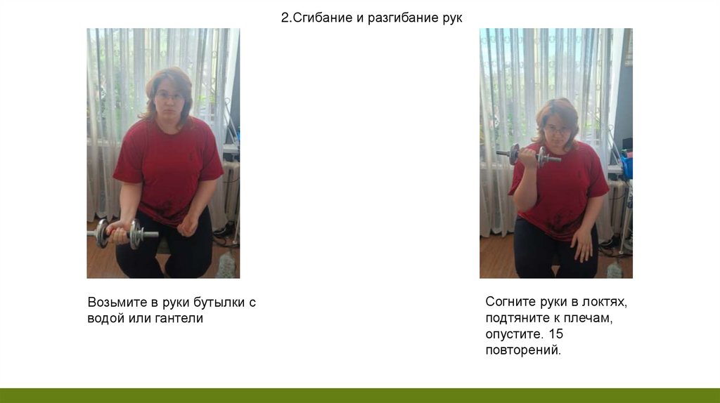 2.Сгибание и разгибание рукВозьмите в руки бутылки с
