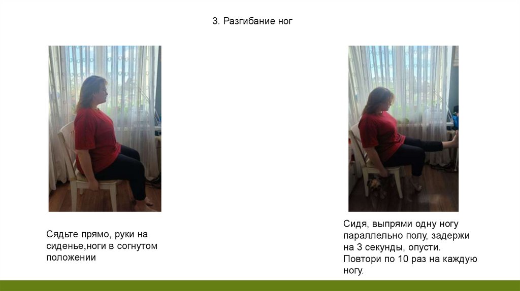 3. Разгибание ногСядьте прямо, руки на