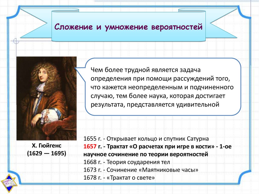 1657 г. - Трактат «О расчетах при игре в кости» - 1-ое