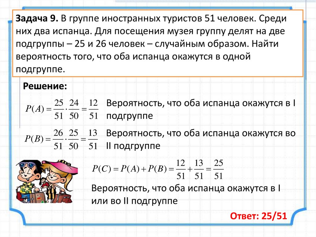 Задача 9. В группе иностранных туристов 51 человек. Срединих два испанца. Для посещения музея группу делят на две