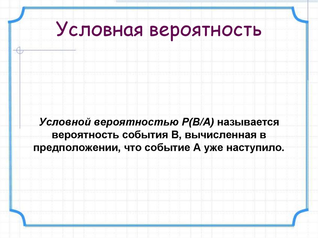 Условной вероятностью Р(В/А) называетсявероятность события В, вычисленная в