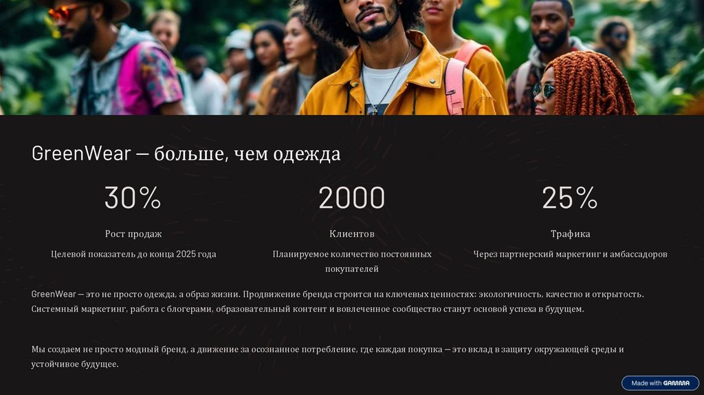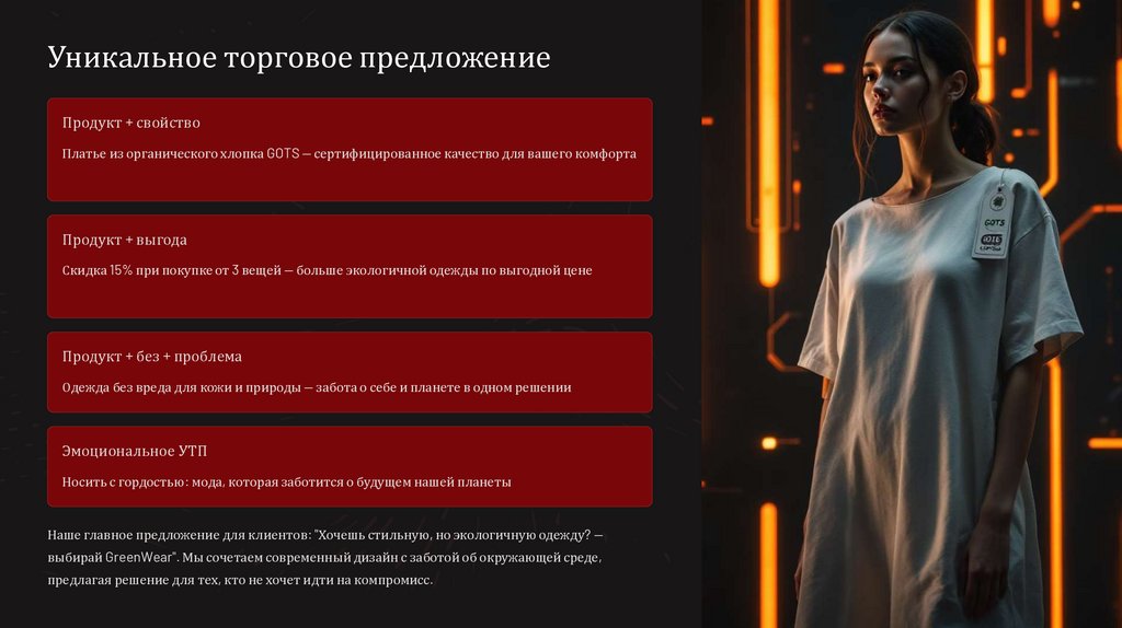 GreenWear — это не просто одежда, а образ жизни. Продвижение бренда строится на ключевых ценностях: экологичность, качество и открытость.