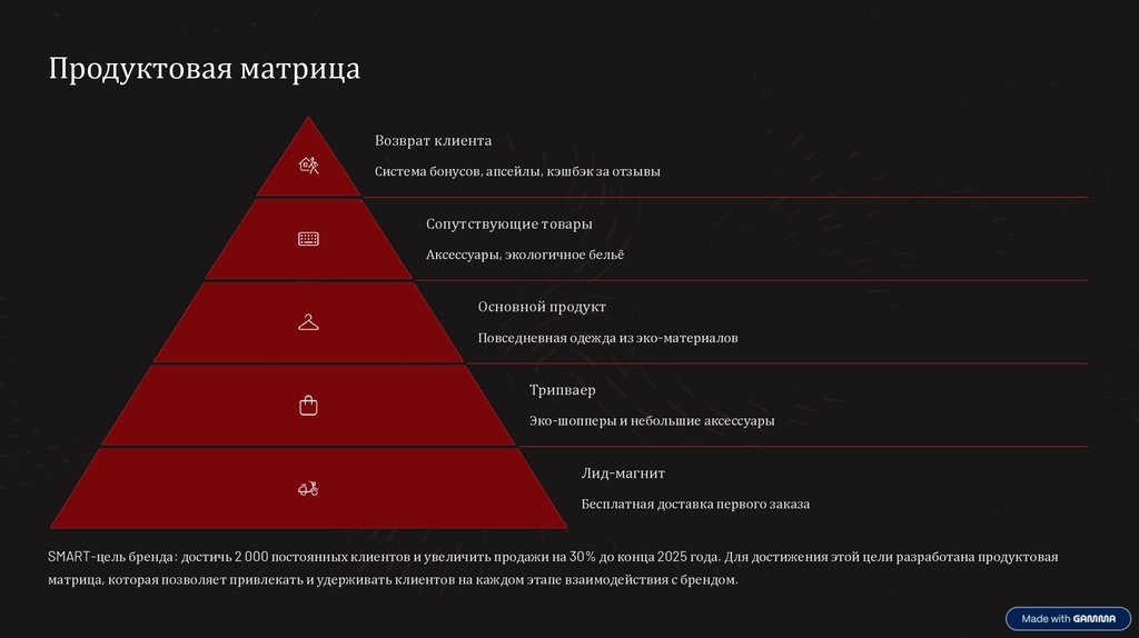 SMART-цель бренда: достичь 2 000 постоянных клиентов и увеличить продажи на 30% до конца 2025 года. Для достижения этой цели разработана продуктовая