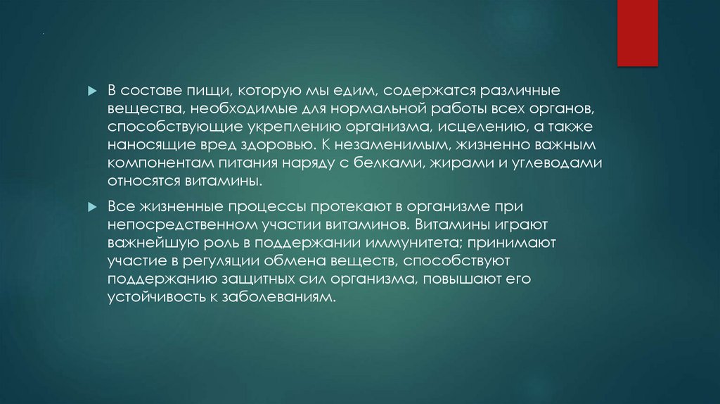 В составе пищи, которую мы едим, содержатся различныевещества, необходимые для нормальной работы всех органов,