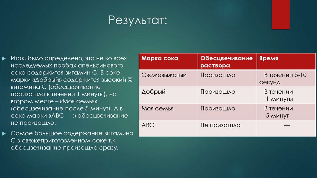 сок, то надо пить свежо выжатые соки. Победу в этом эксперименте одержали