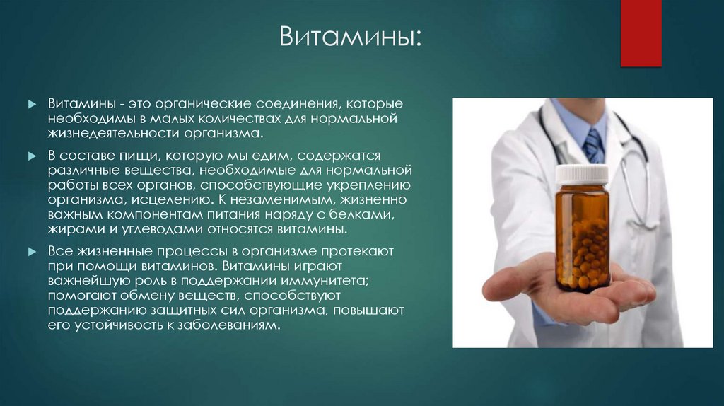 Витамины - это органические соединения, которыенеобходимы в малых количествах для нормальной