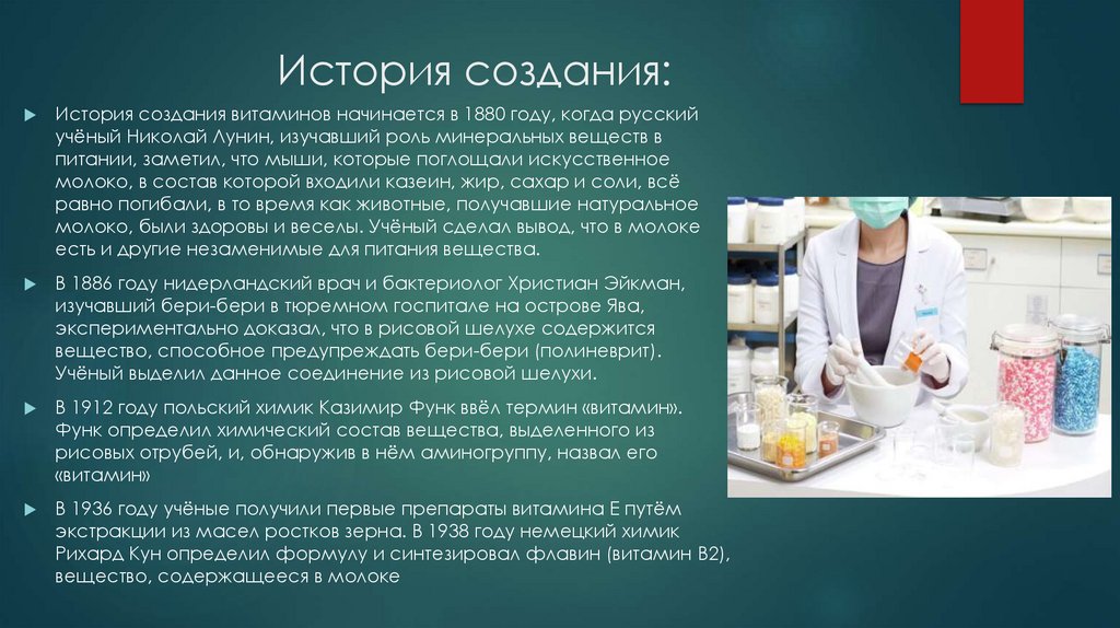 История создания витаминов начинается в 1880 году, когда русскийучёный Николай Лунин, изучавший роль минеральных веществ в
