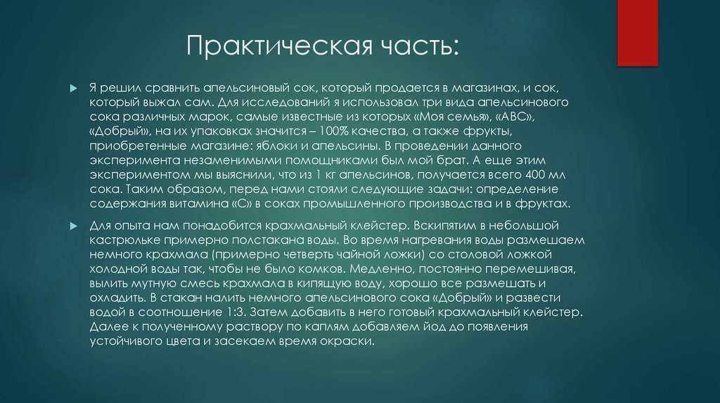 Я решил сравнить апельсиновый сок, который продается в магазинах, и сок,который выжал сам. Для исследований я использовал три вида апельсинового