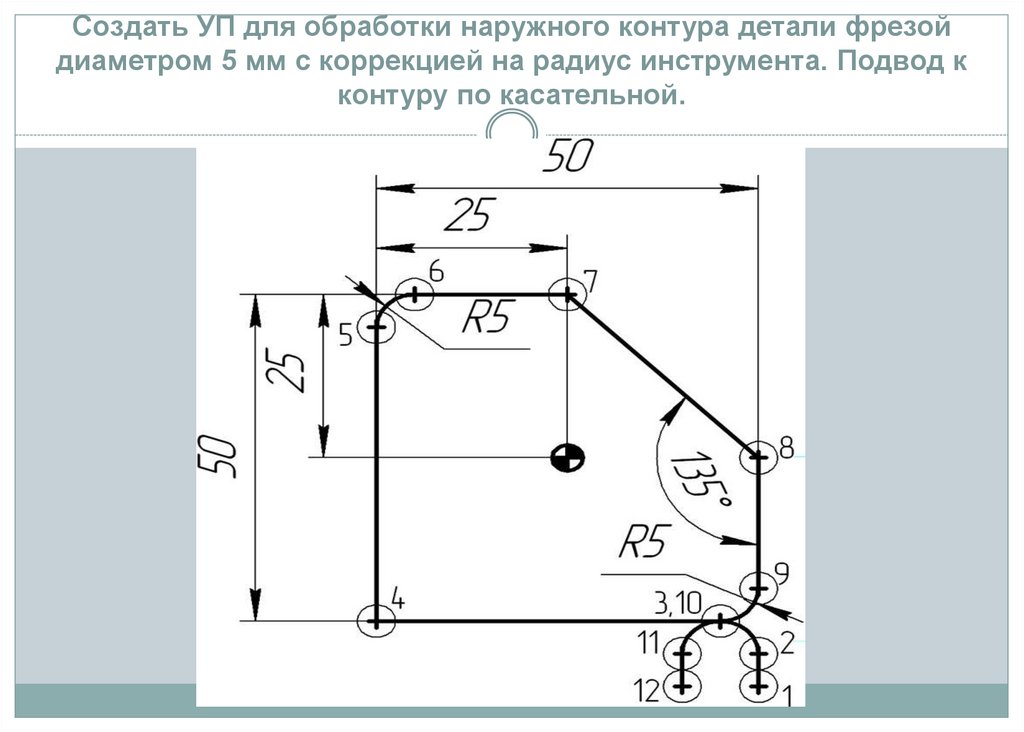 11. Создать УП для обработки наружного контура детали фрезой диаметром 5 мм с коррекцией на радиус инструмента. Подвод к контуру по