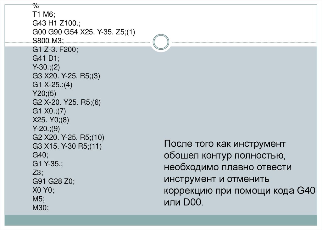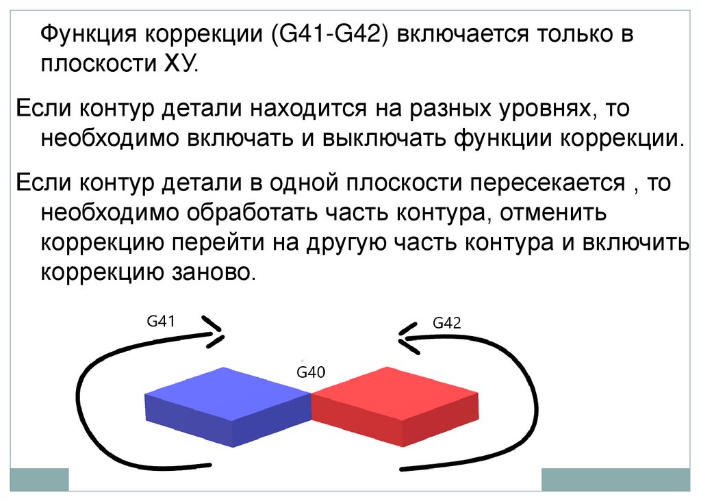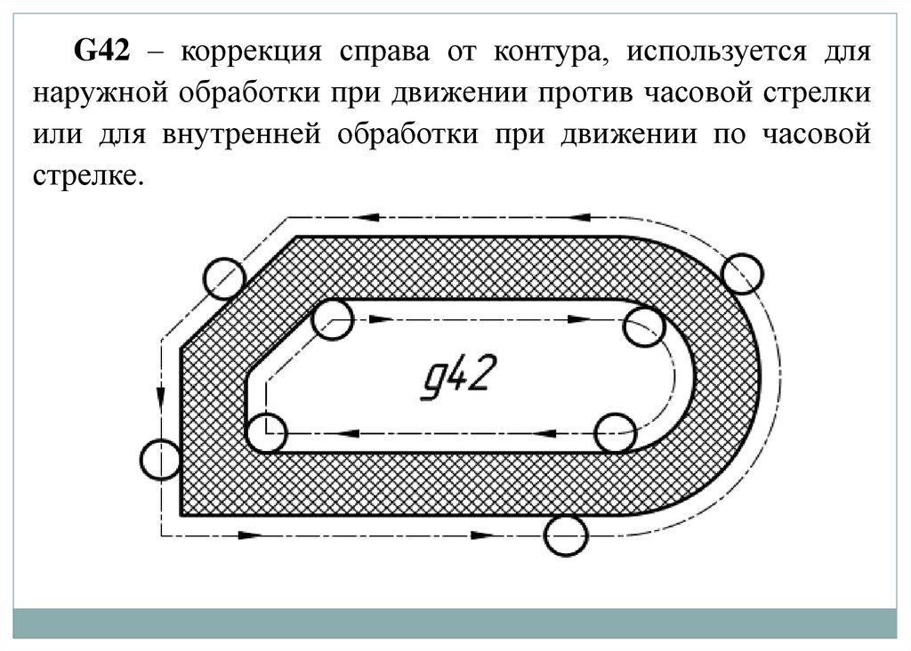 G42 – коррекция справа от контура, используется длянаружной обработки при движении против часовой стрелки